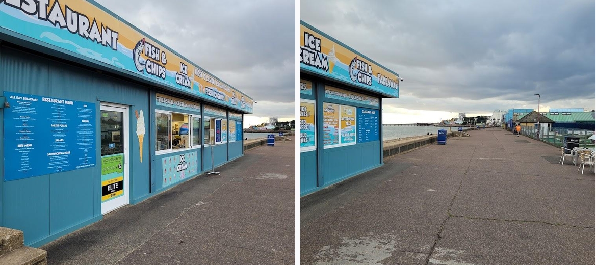 Popped to Sounthend on Sea after a visit nearby and we always get our fish and chips fom the front take away counter, this time as the weather wasn't ideal we decided to sit in and glad we did. The food was delicious and it felt a bit more "posh" served on a plate with a knife and fork with side salad and peas. The staff were very friendly and very welcoming. Will be eating in again next time we visit.